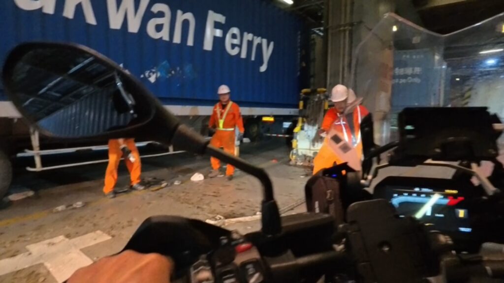 4人がかりで私のオートバイを固定してくれますが 言葉が全くわからない私はこの人たちにはかなり鈍臭かったのでしょう。舌打ちのようなものも聞こえてきましたが何とか位置を合わせて固定してもらいました。